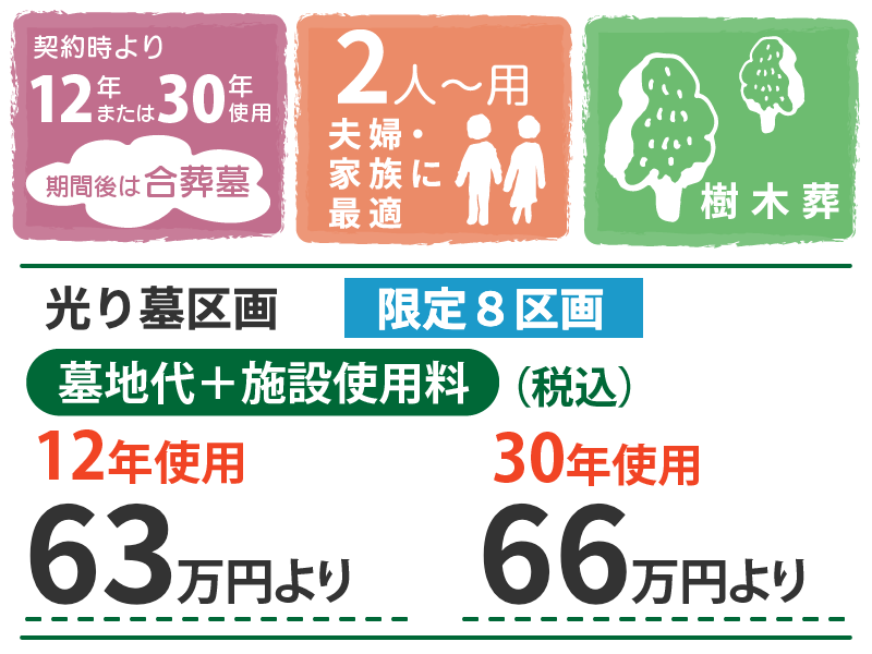 墓地代+施設使用料 12年使用 63万円より/30年使用 66万円より